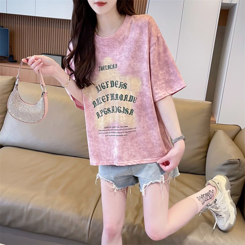 2025 新しい純粋な綿の tシャツ女性のルーズスターレターデザインニッチ絞り染めラウンドネック半袖トップ女性のためのトレンディな