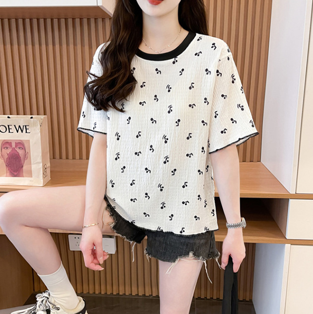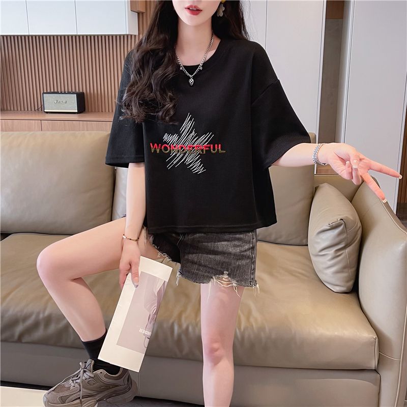 クロスボーダーアメリカンショートTシャツ女性用、小柄なワッフルルーズレター、女性用多用途夏用薄手半袖トップス