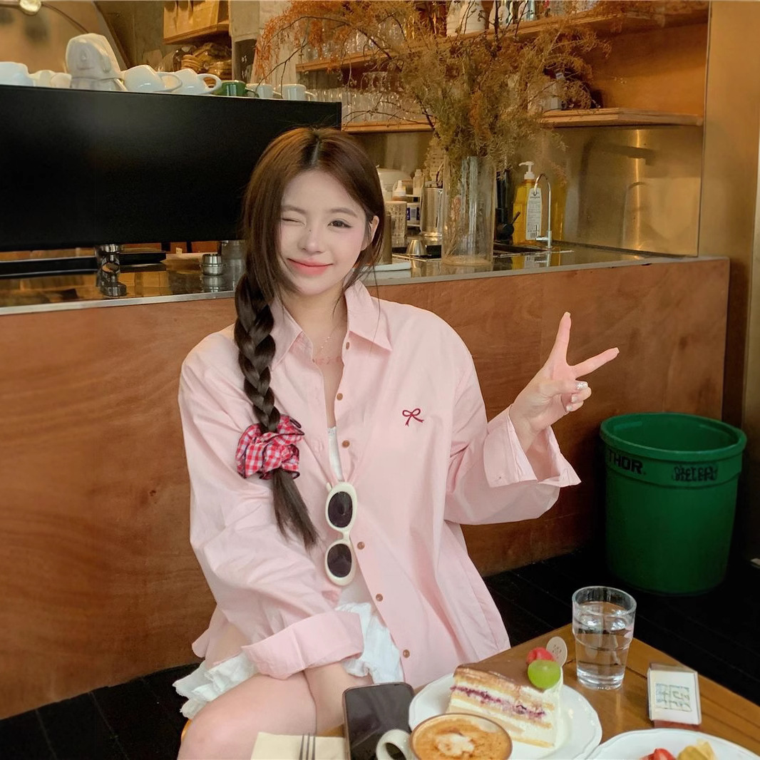優しいピンクのリボン刺繍ポロカラーシャツ女性のための 2025 春の新しいルーズカジュアル長袖トップ