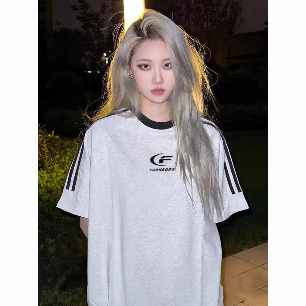 アメリカンレトロな3ストライプスプリント半袖Tシャツレディース2025年夏新作ゆったりオーバーサイズ半袖トップス