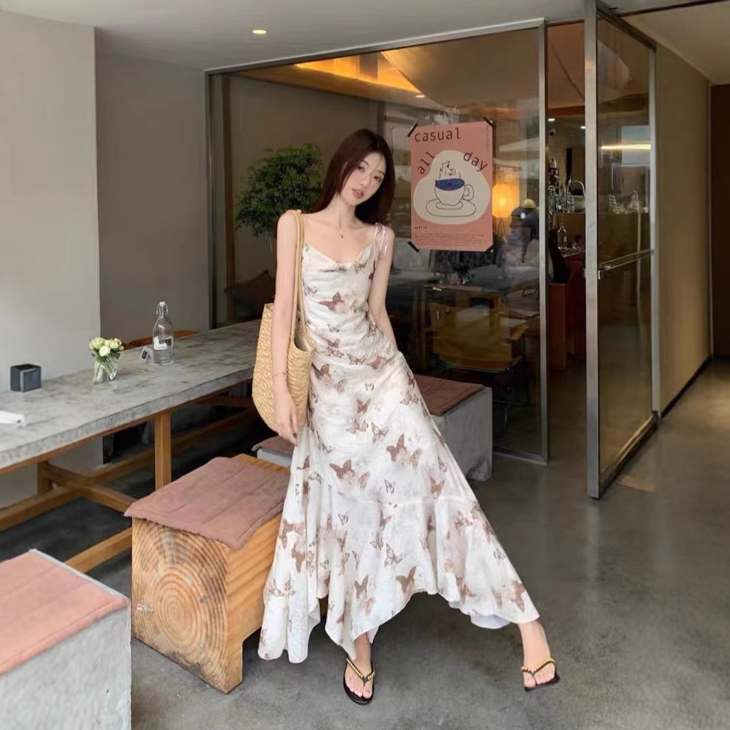 蝶サスペンダードレス夏の新しい休暇プリント 2025 気質不規則なスカート新しい中国風の妖精のスカート