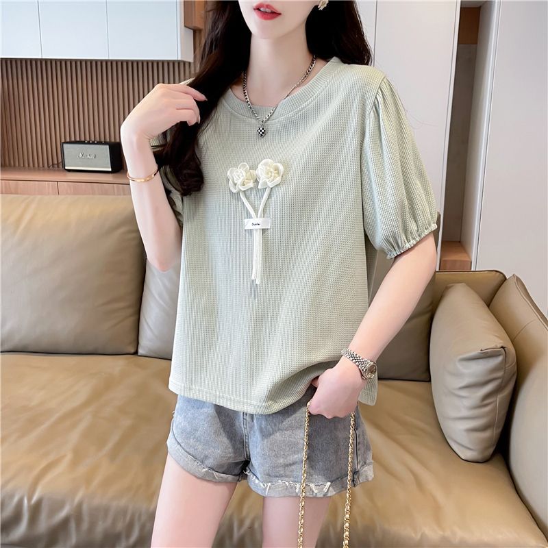 ワッフル Tシャツレディース半袖デザインニッチフラワー 2025 夏新作薄いパフスリーブラウンドネックトップ