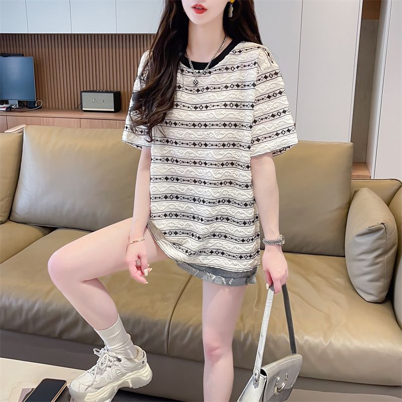 ストライプ半袖tシャツ女性高級感夏の新型の薄いタイプのゆったりした大きいサイズのカジュアルなラウンドネックの上着の女性のファッション