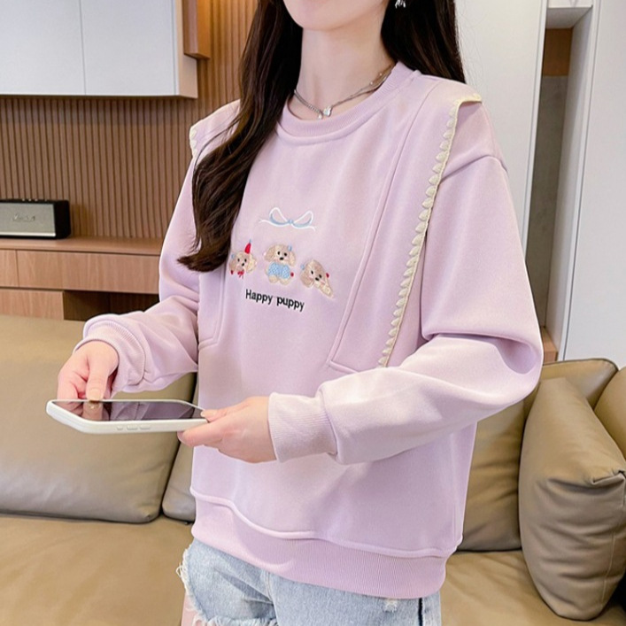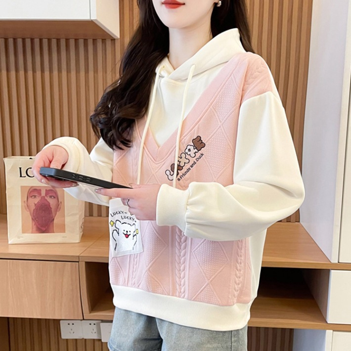 色の衛衣の女性vネックの刺繍のアニメ2025の新型の春と秋の薄い金の長袖の偽の2つの大きいサイズの上着の女性