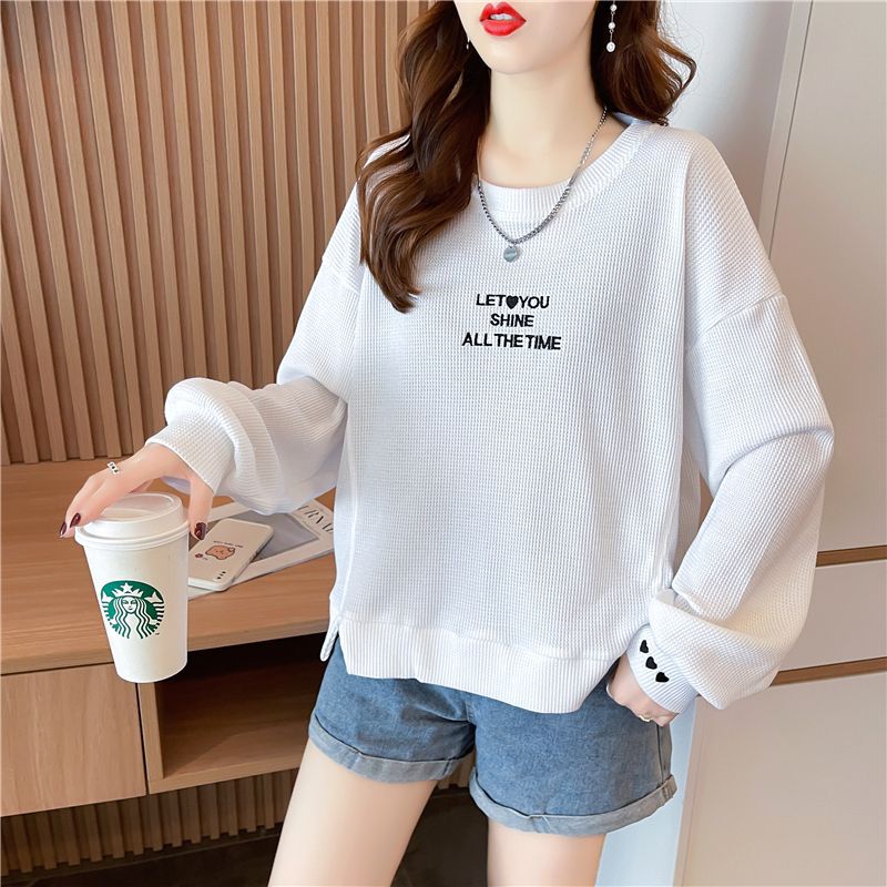 ワッフルのガードルの女性の丸首の日本のゆったりした大きいサイズの刺繍の愛の春と秋の薄いタイプの2025新型の長袖の上着