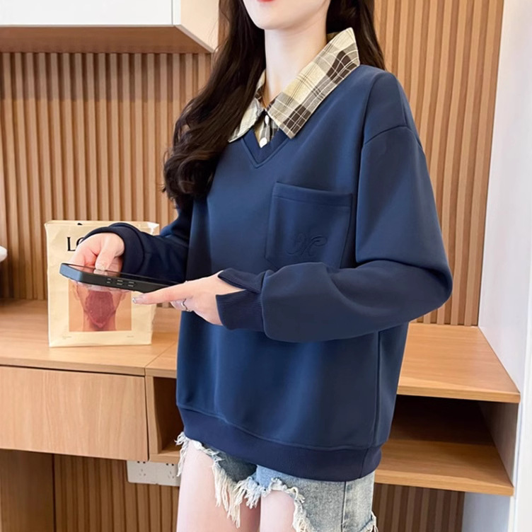 大きいサイズの格子polo襟の衛衣の女性のデザイン感の小さい大衆のアメリカの復古の薄い金の外はカジュアルな長袖の上着の女性を着ます。