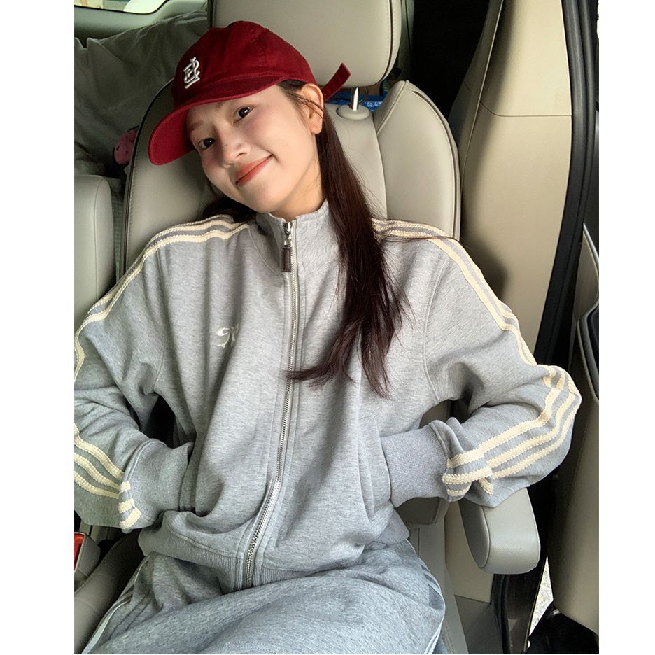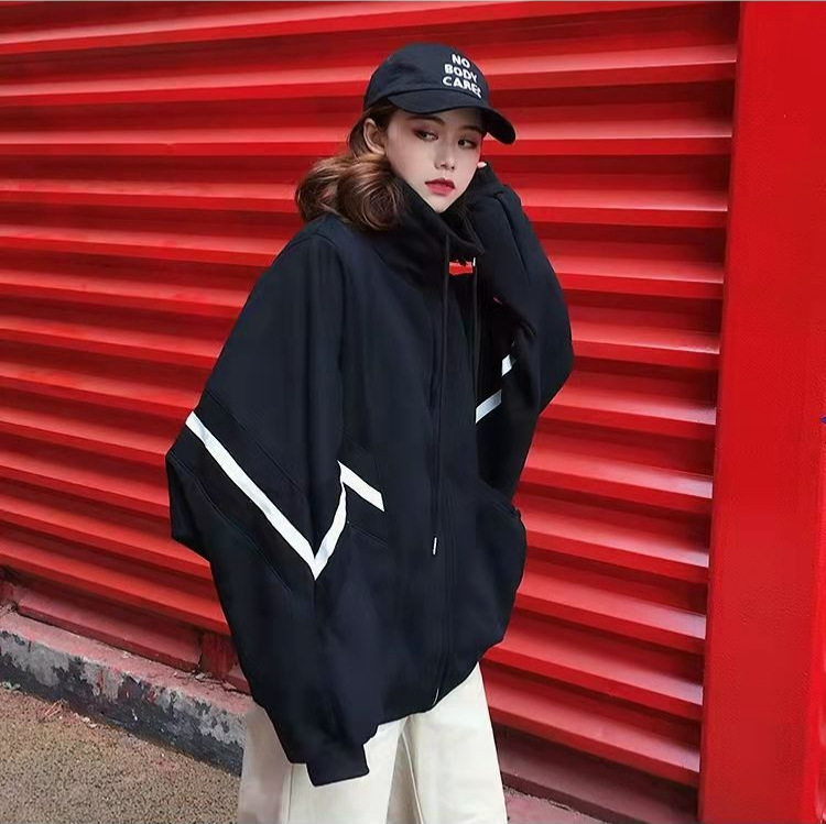 ジッパー付きの女性春と秋の新型の肩はやせています。アメリカのレトロな三条のバーのデザイン感があります。