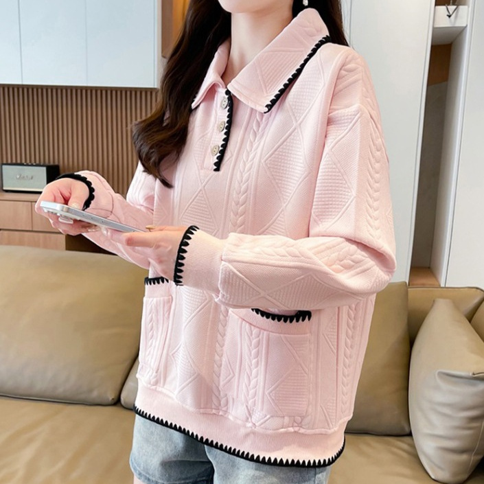 クロスボーダーのジャカードの女性のゆったりした怠惰な風2025新型春秋の薄いpolo襟の長袖のガーディアンの女性の卸売り