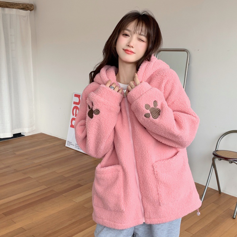 2025年秋冬新作 ラムウールスウェットシャツ レディース 韓国風 ゆったり 可愛い フード付きカーディガンジャケット 女性用