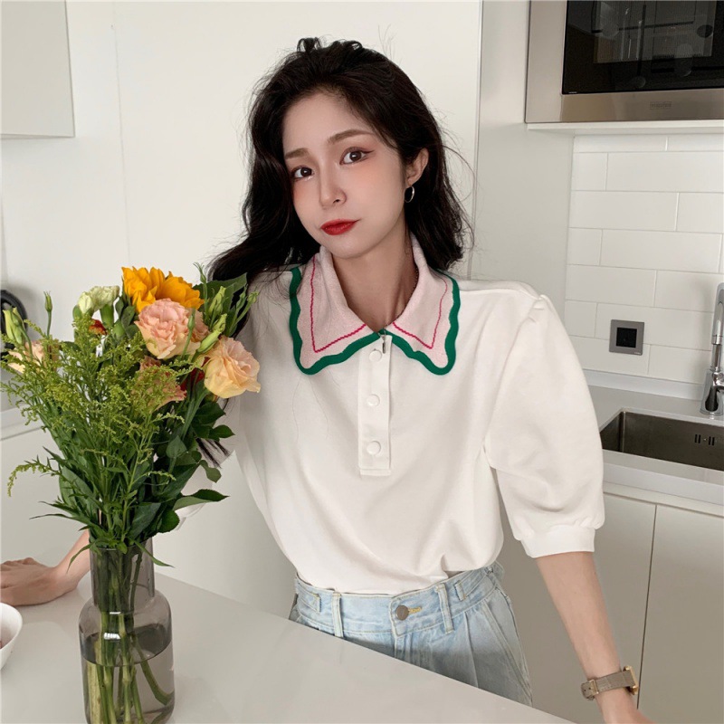 クロスボーダー 2025 tシャツ半袖女性の夏のポロ襟ホットガールショートニットコントラストカラーパフスリーブトップ女性卸売