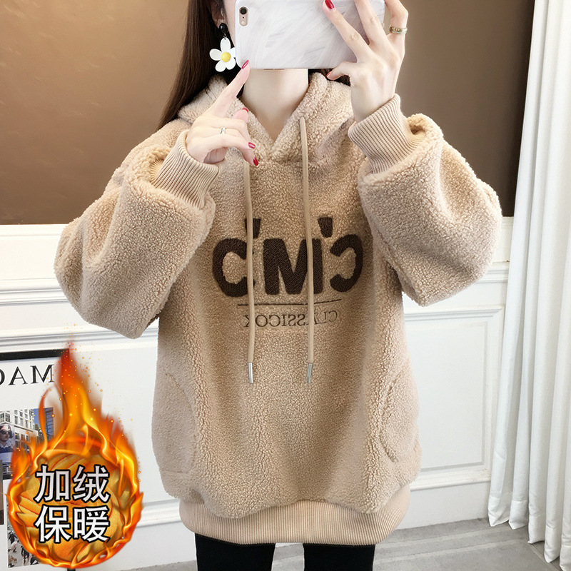 クロスボーダーの大きいサイズのベルベットの厚いガードルのスーツの女性の冬のファッションの帽子の長袖の上着のアルファベットの刺繍の3つのセット