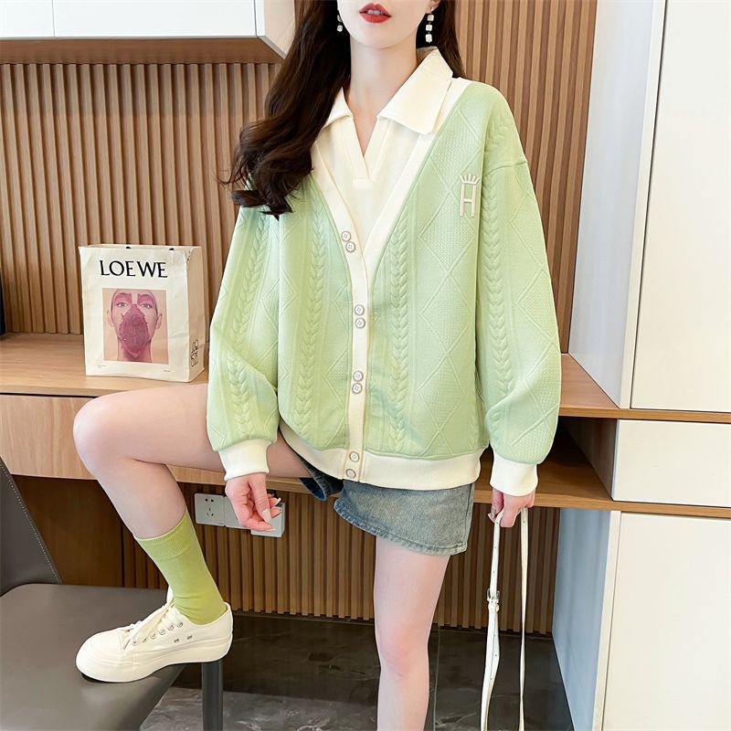 ベルベットの厚い偽の2つのガーディアンの女性2024の新しい文字の中の長い長袖は怠惰な風のゆるいガーディアンをつなぎ合わせます