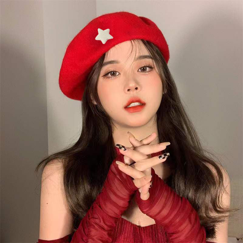 ネット紅の白い星の赤いベレー帽の大きい頭の周りの祝日の雰囲気感の画家の帽子は顔のギャルの大衆の潮を現します。