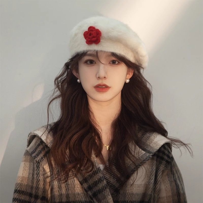 白いウサギの毛のベレーの帽子の女性の2024秋冬の大きい頭の周りのぬいぐるみの花の保温の画家のつぼみの帽子は顔が小さいです。
