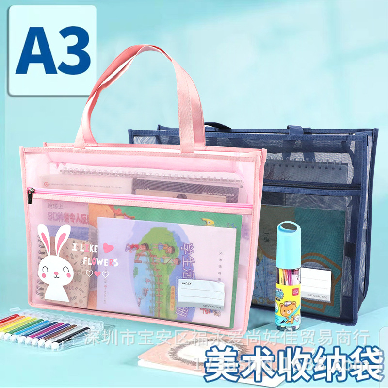 A3手提げ袋美術収納袋学生補習袋大サイズと寛大な強靭な龍網糸学生科目ファスナーバッグ