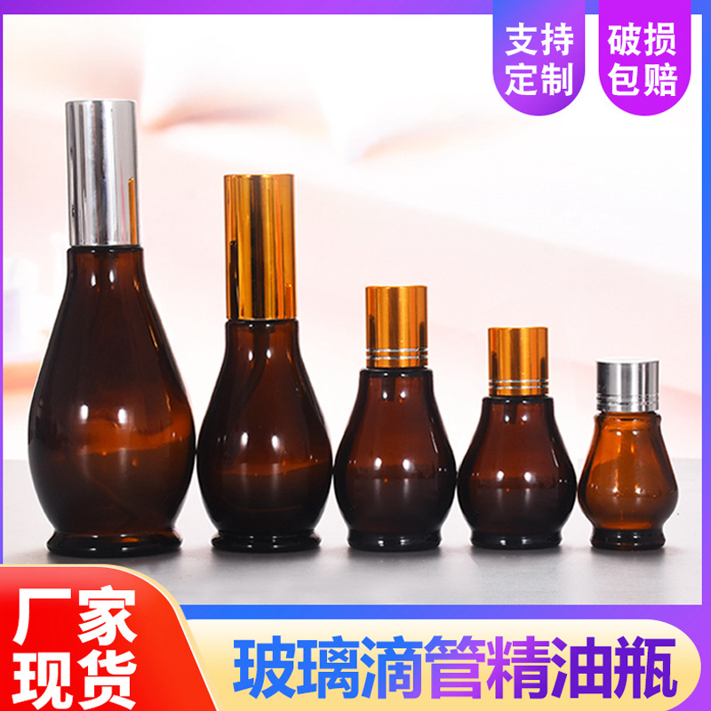 茶色のシングルひょうたんエッセンシャルオイルボトル、スポイトボトル、茶色の遮光ガラスボトル、小さな薬瓶、原液ボトル、スキンケア製品詰め替えボトル