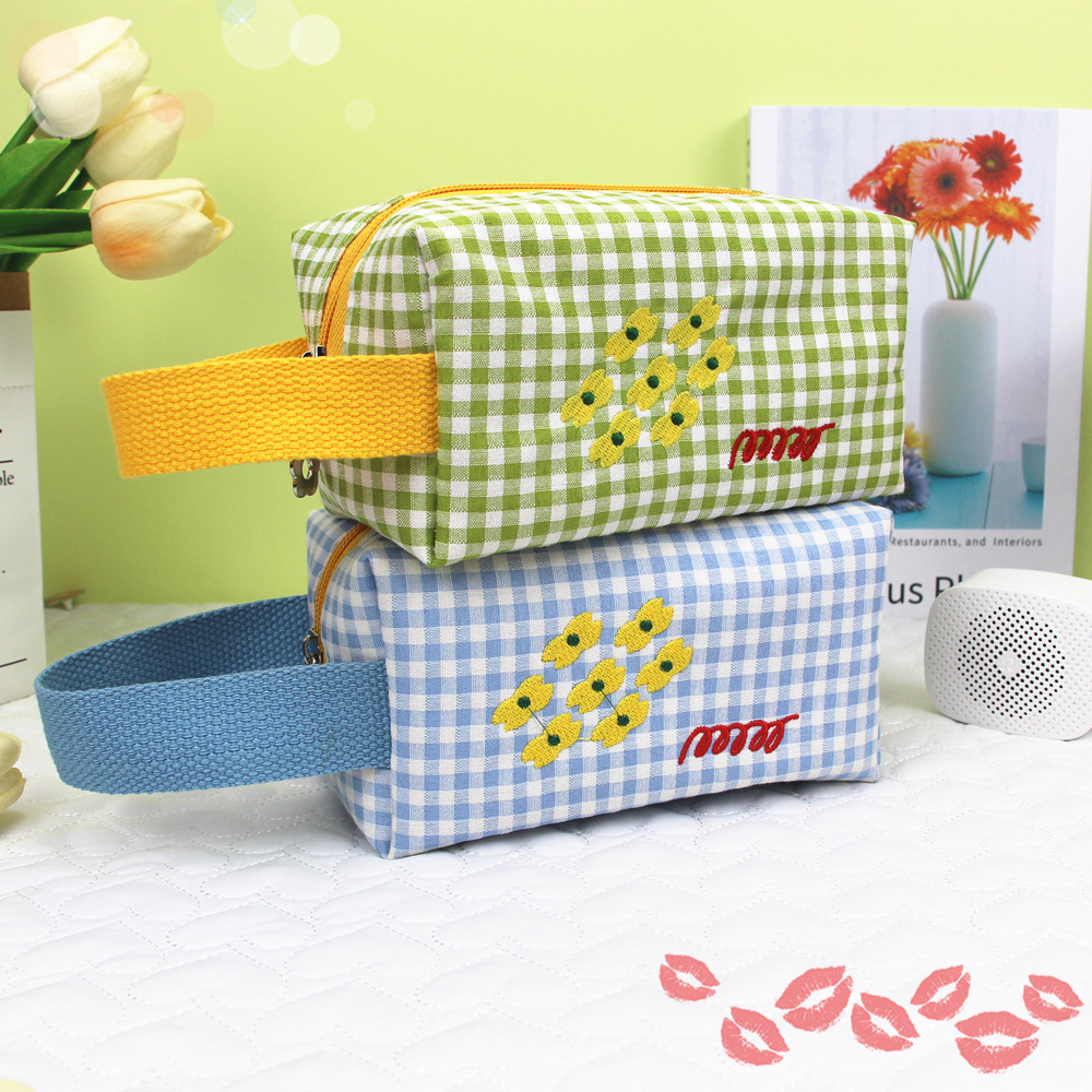 Ins風小清格子愛刺繍化粧バッグかわいい大容量携帯収納バッグ洗面学生筆袋