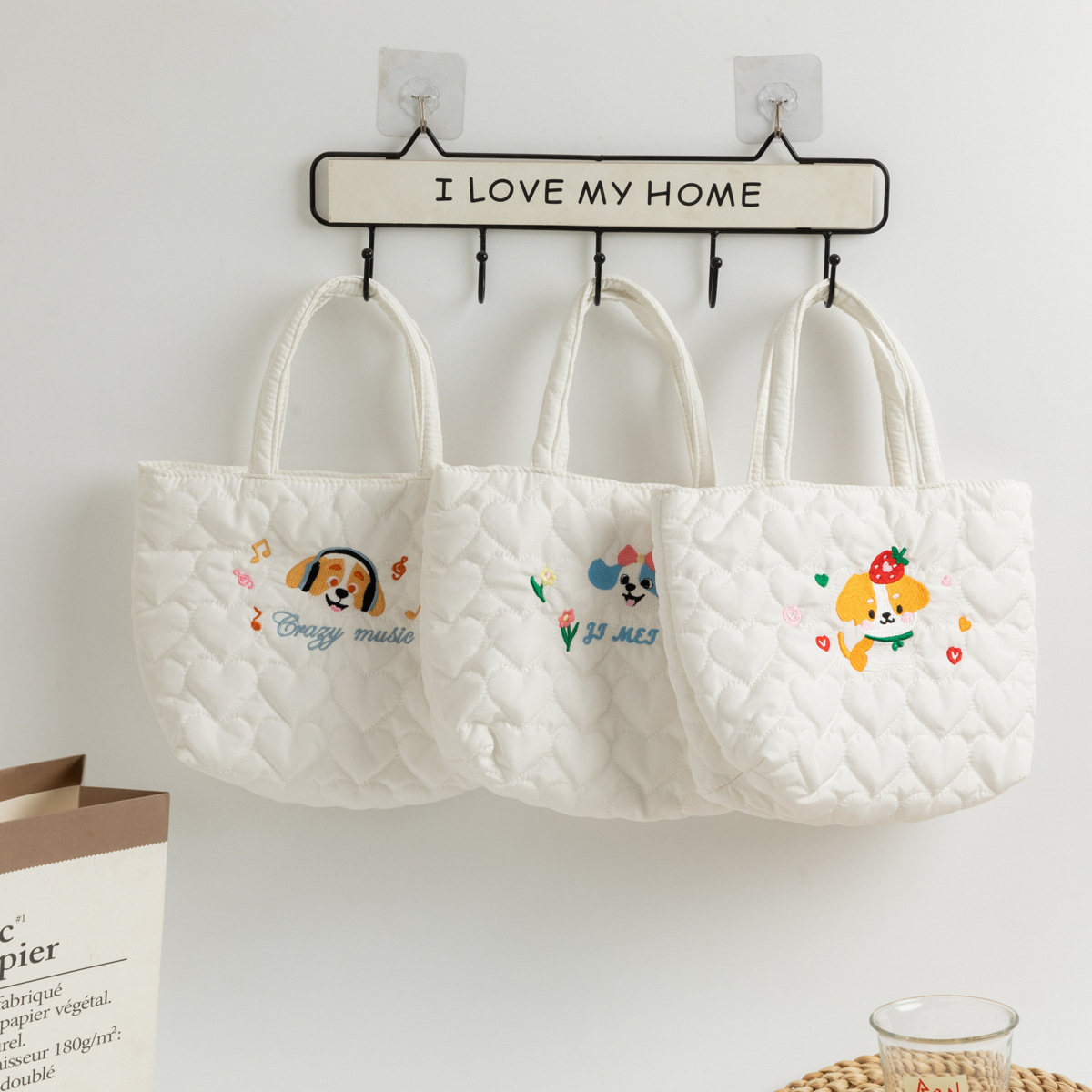 お弁当バッグかわいい犬刺繍バッグ韓国insキルティング手提げ袋女性ショッピングバッグママバッグ