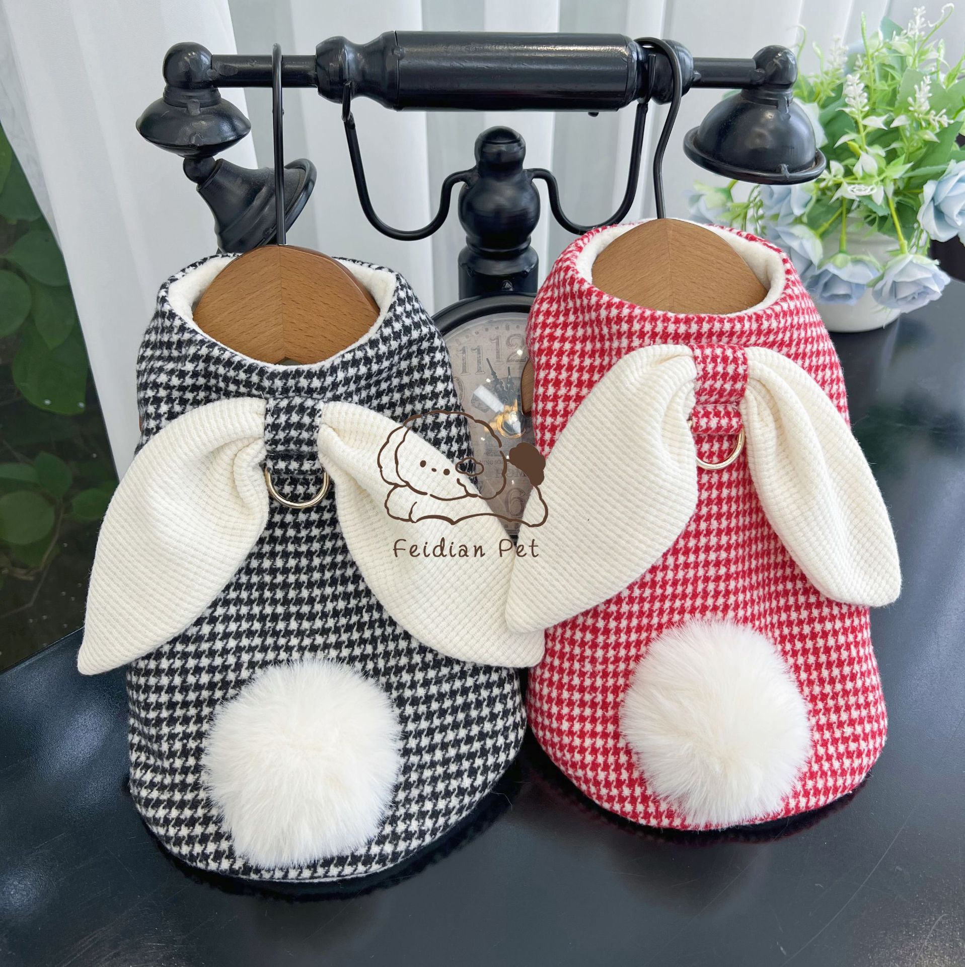 秋冬の新型ペットの千鳥格のかわいいウサギの耳のぬいぐるみの馬甲の小型犬の旅行のd字は保温の服を掛けます。