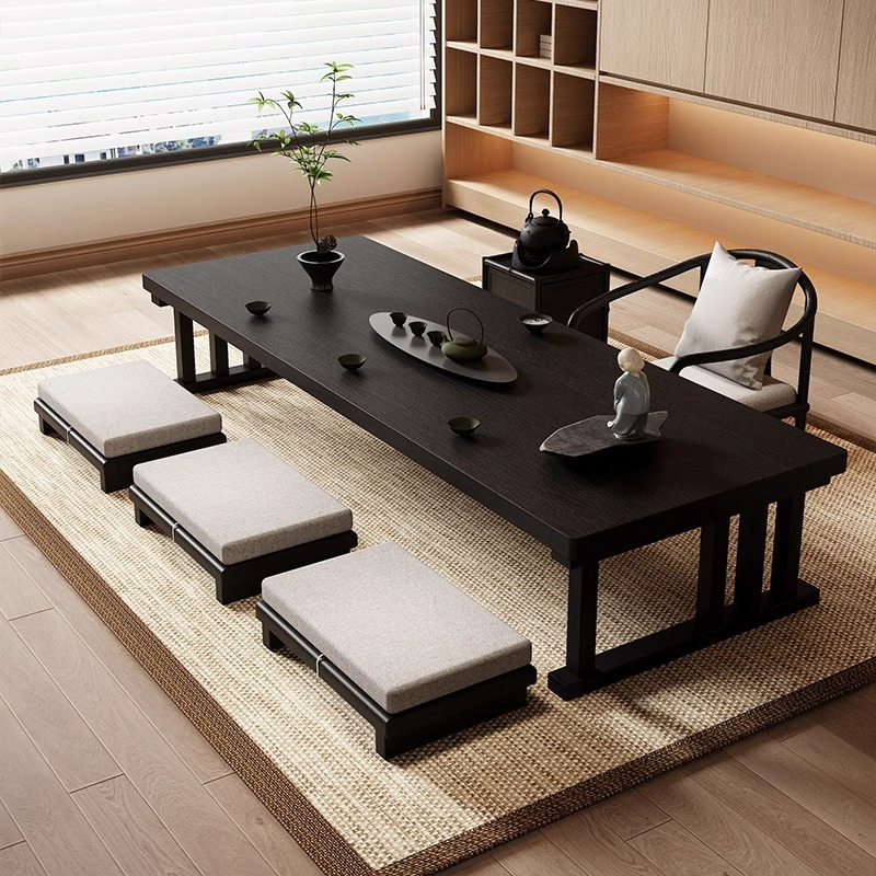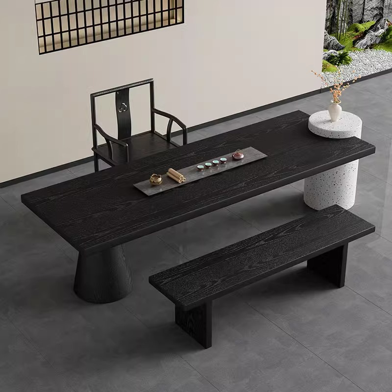 中世スタイルの黒炭化ティーテーブル無垢材大型ボードわびさびスタイルティーテーブルアクリルモダンバルコニーティーテーブル