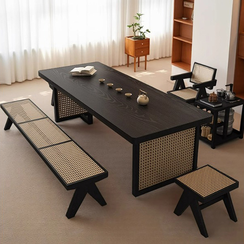 寂風黒実木藤編茶卓茶芸会ホール接待禅椅子炭化黒泡茶テーブルと椅子の組み合わせ