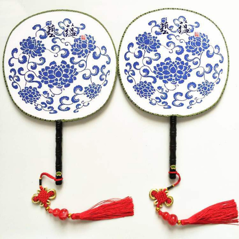 クラフトファン古代スタイル青と白の磁器ラウンドファン 24cm ダンスラウンドパレスファン子供のホリデーパフォーマンスチャイナドレスキャットウォーク