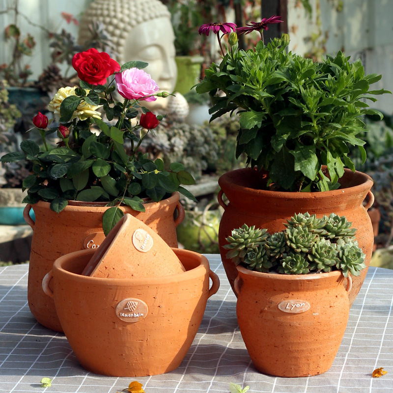 赤い陶器の植木鉢、粗い陶器のポット、バルコニーガーデン、多肉植物の緑の植物の鉢植え、通気性のある胡蝶蘭の粘土ガーデニング装飾
