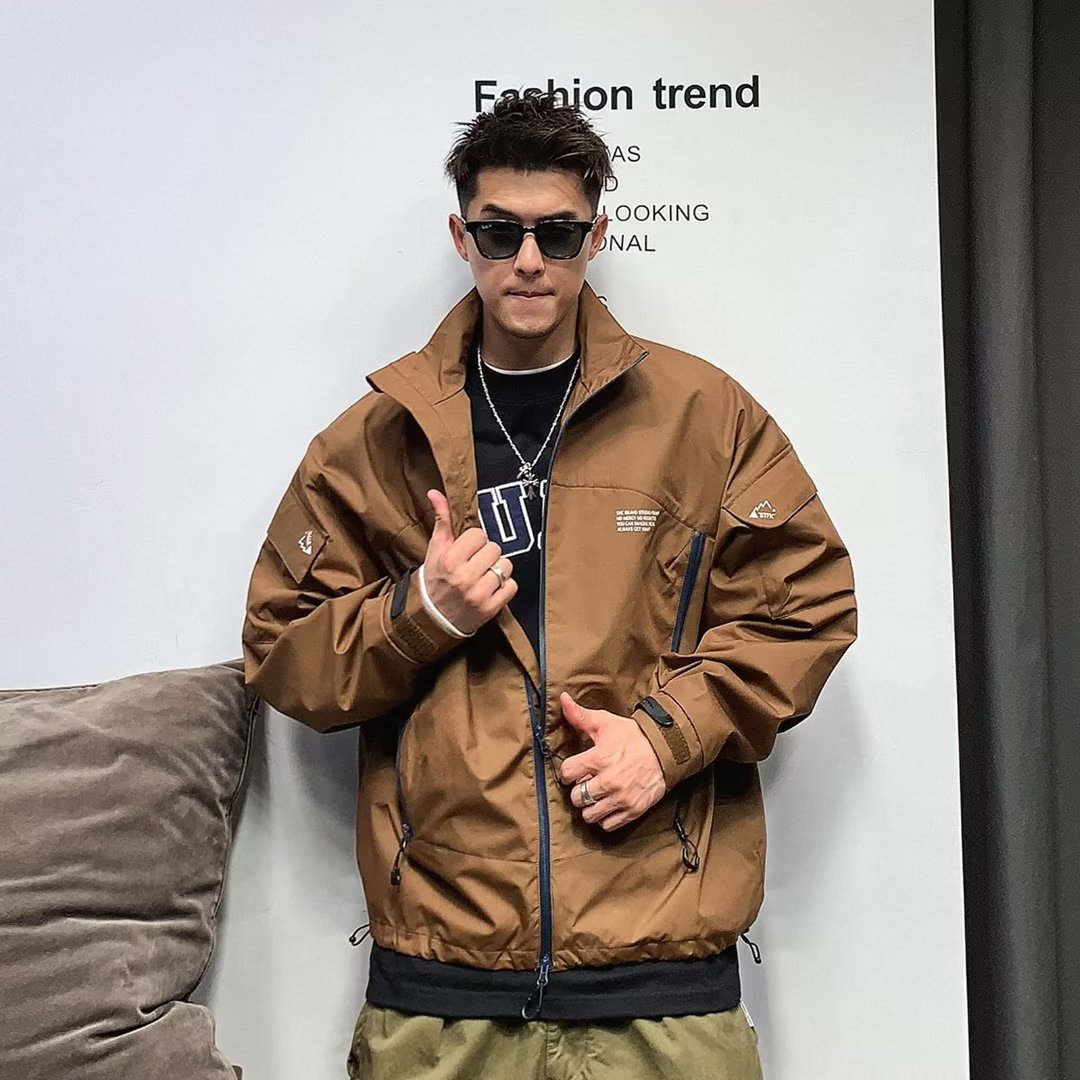 春と秋のアウトドアのシンプルなレトロな日本のカジュアルなスタンドカラーの機能風工装ジャケットのゆったりとしたコートの男性
