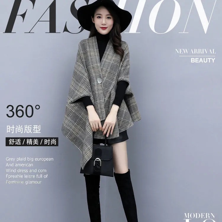 8966 ケープウールコートレディースショート2024秋冬新作小柄ショールタータンチェックコートハイ