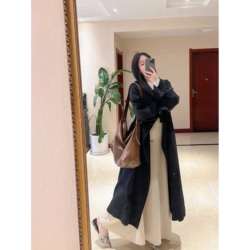 9259 春と秋の新しい中国風の膝丈ソリッドカラーウインドブレーカー女性のためのロング長袖巾着多用途