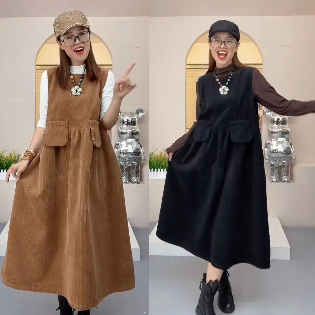 8916 # ファッション 2024 秋冬新コーデュロイミッドレングスドレスレディース大きいサイズ多用途ポケットバック