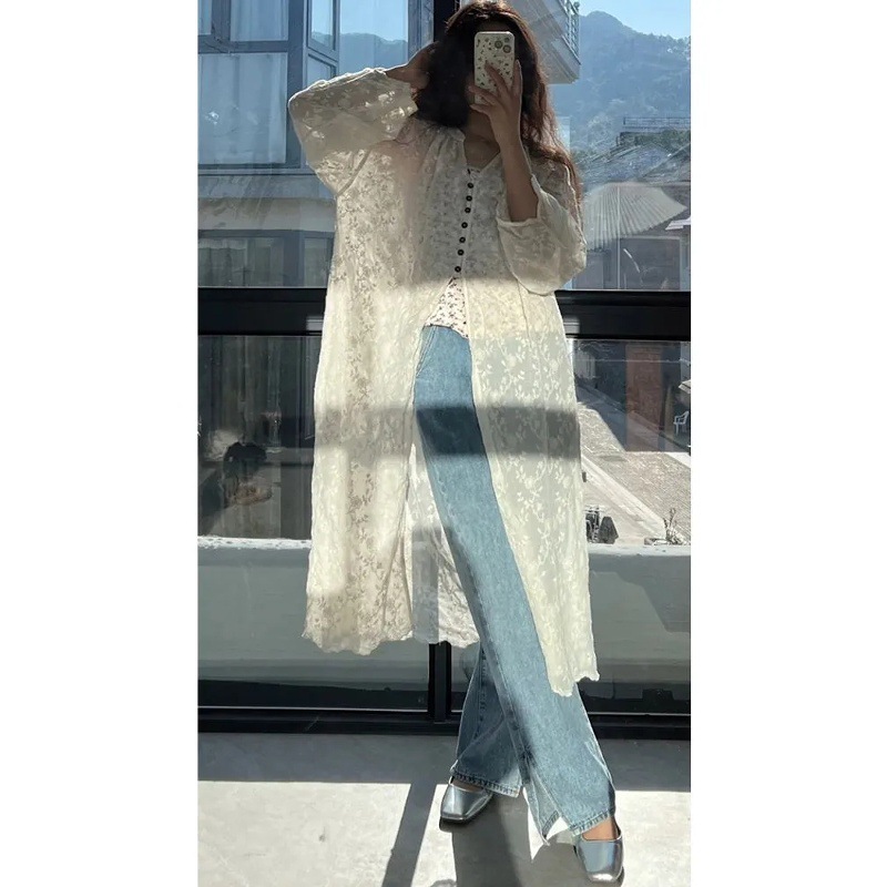 9108 美しい小さなシャツインターネットセレブホットスタイル 2024 人気の白いロングレースカーディガンシャツ女性のデザインニッチ
