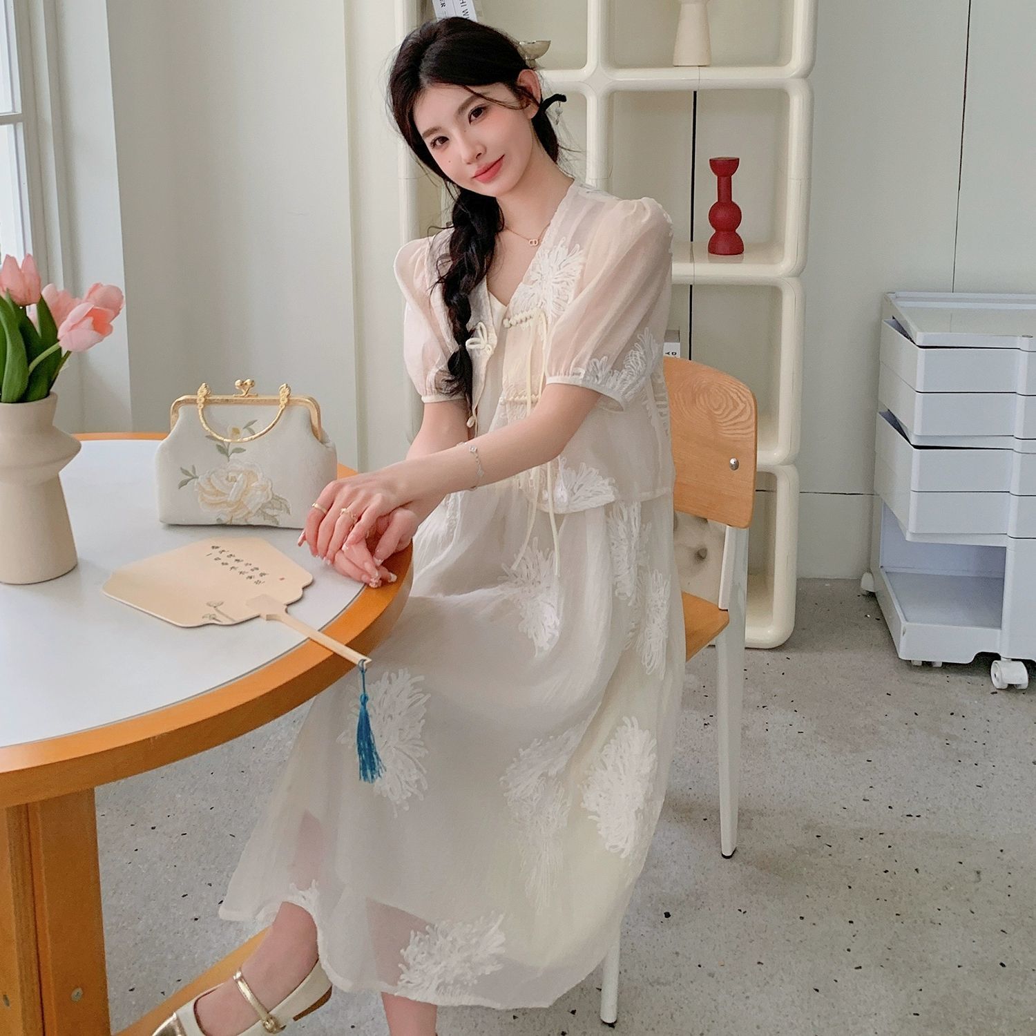 9385 スタイルサスペンダードレスレディース夏 2025 新しいハイエンド中国風刺繍バックルツーピースロングスカート