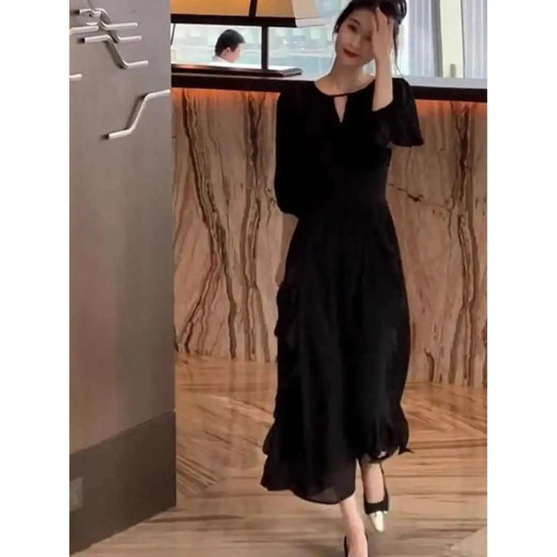 9275大きいサイズの婦人服のフランス式のヘボン風の黒いワンピースの女性の夏服の太っているmmの洋の気質は腰を収めて年齢のシフォンを減らします。