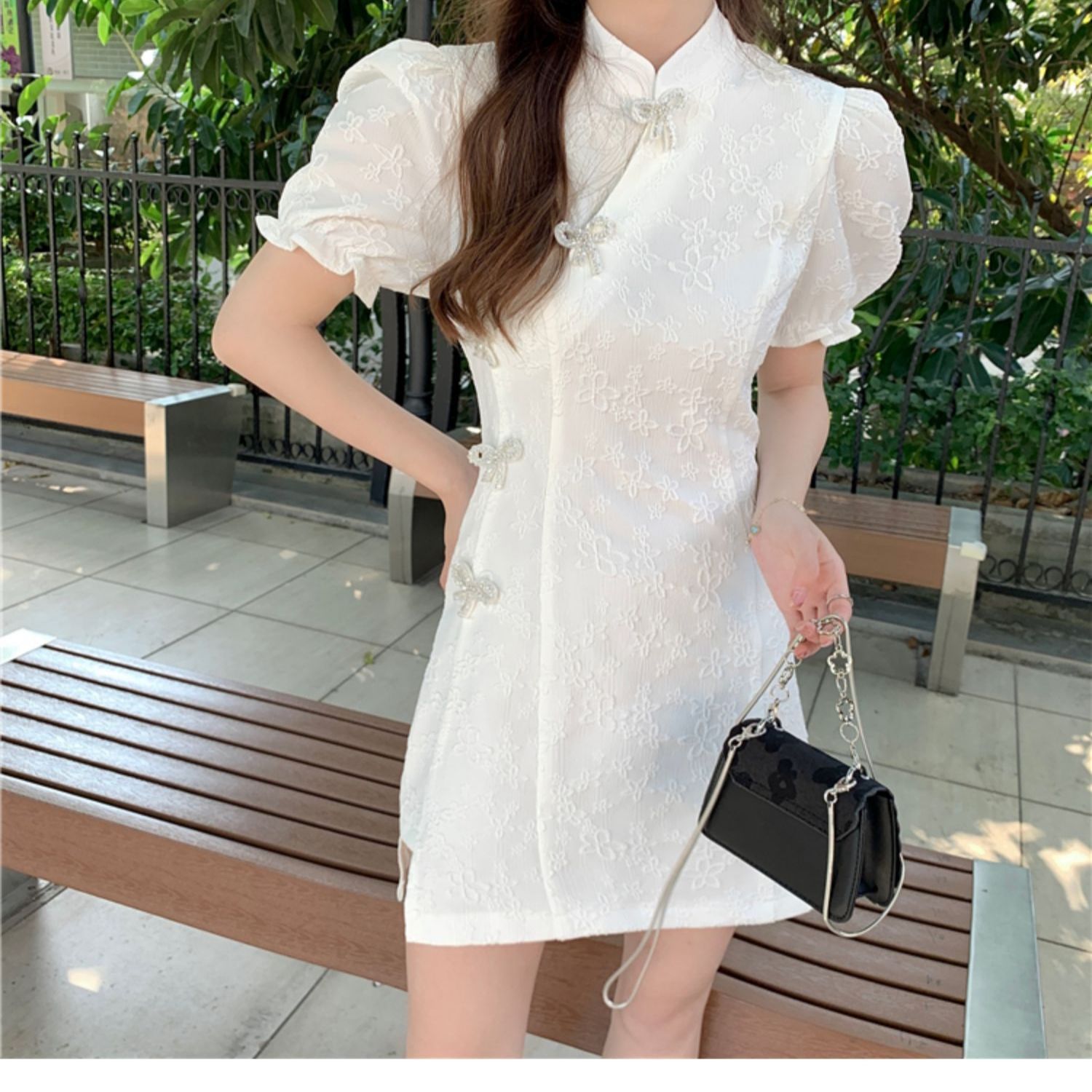 白改良チャイナドレス 2025 夏の新ファッション小柄な女の子痩身気質ジャカードドレス大きいサイズ