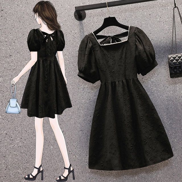 8891 夏の新しいヘップバーンスタイルのウエスト痩身 A ラインドレス気質お腹カバー年齢軽減パフスリーブジャカードスカート