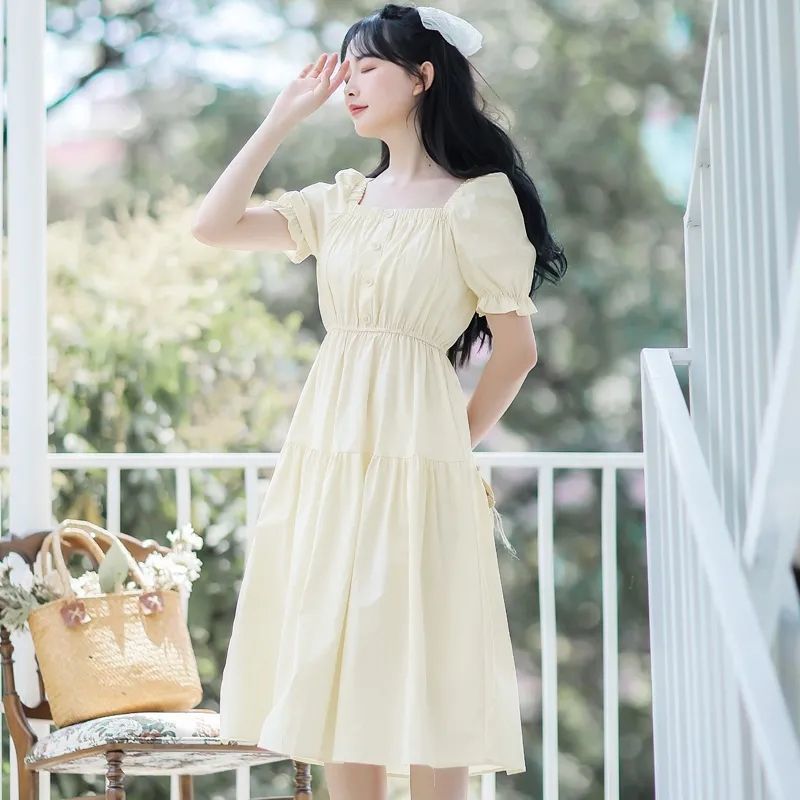 今年の新しい痩身人気の海辺の雰囲気のドレス海辺の雰囲気の白いスクエアネックウエストドレス
