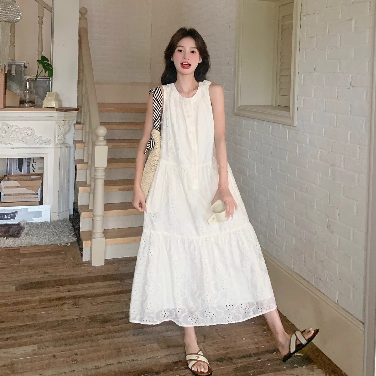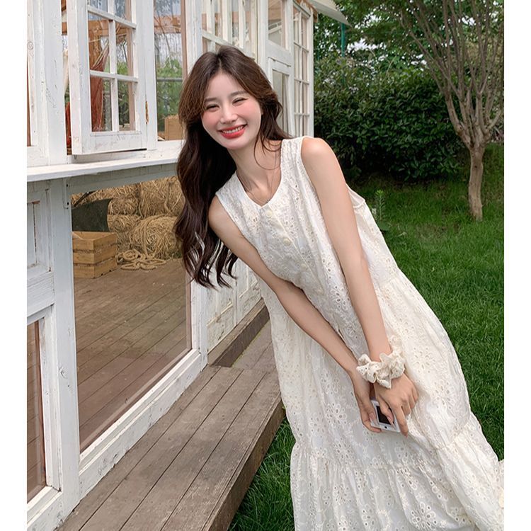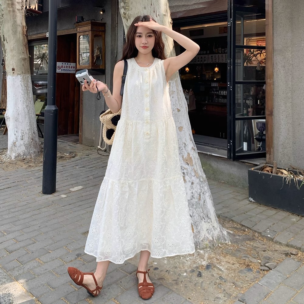 中空刺繍ドレス女性の夏の 2025 新しいフレンチスタイル新鮮で超見栄えの良いノースリーブ白ロング大きいサイズ