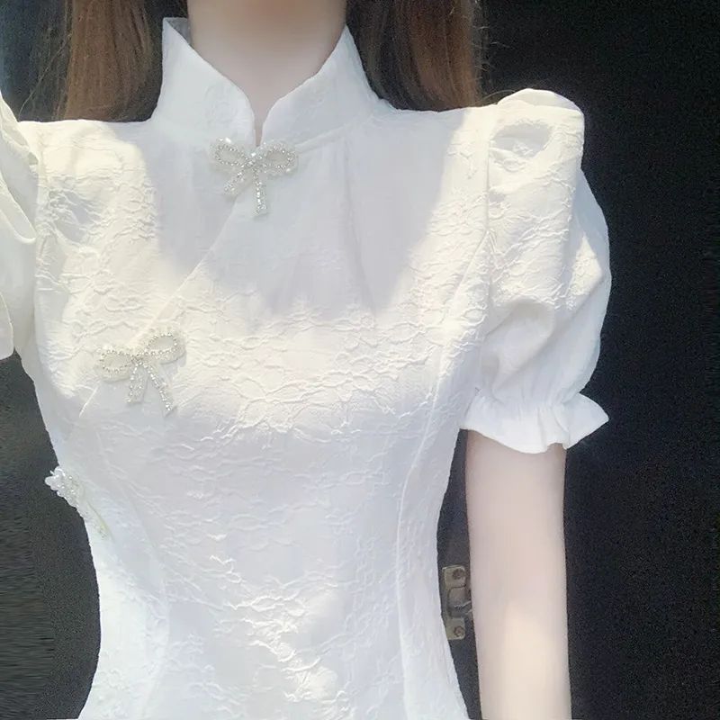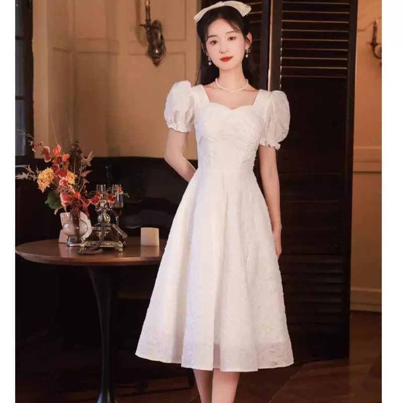 女性用イブニングドレス、軽くて豪華なニッチハイエンドフレンチハイエンドセンス、登録証明書、女性用白い婚約ドレス、パフスリーブ
