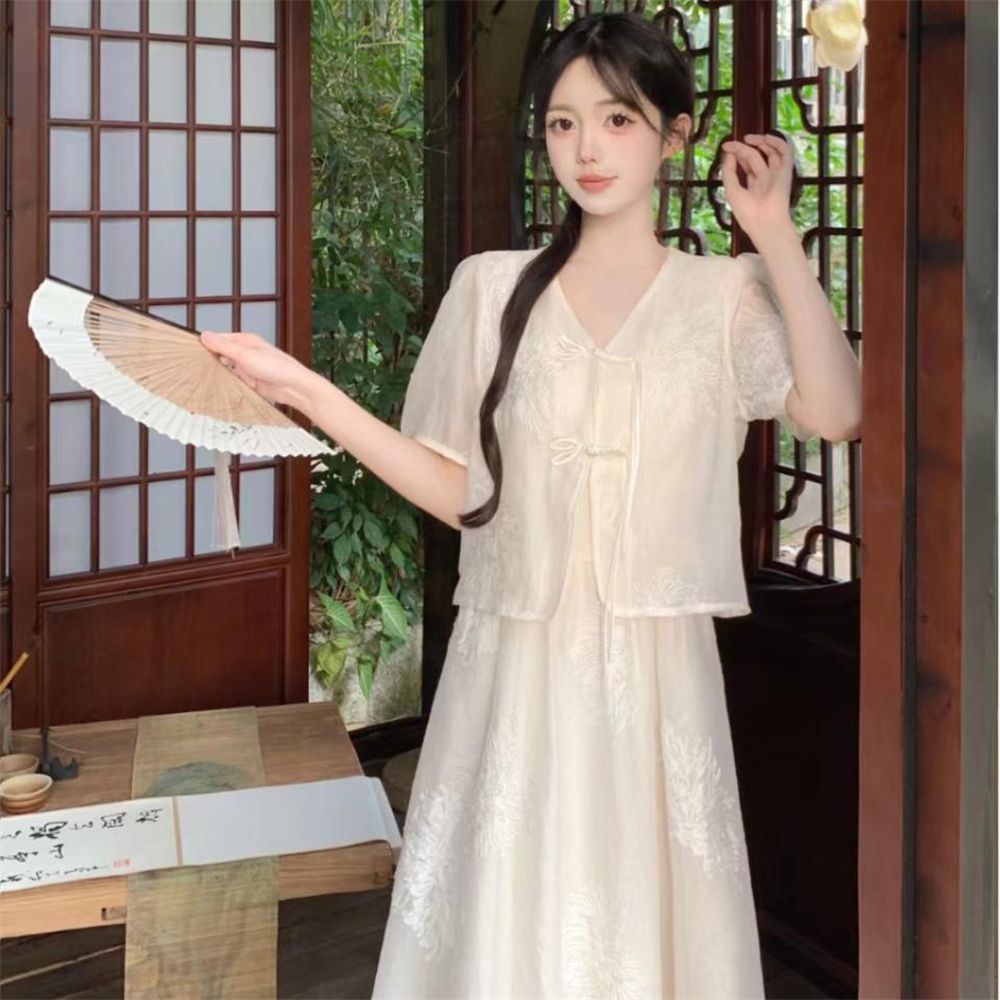 9385 チャイナドレス新中国風スカート夏プラスサイズファットmm刺繍ジャカード気質Vネックツーピースドレス