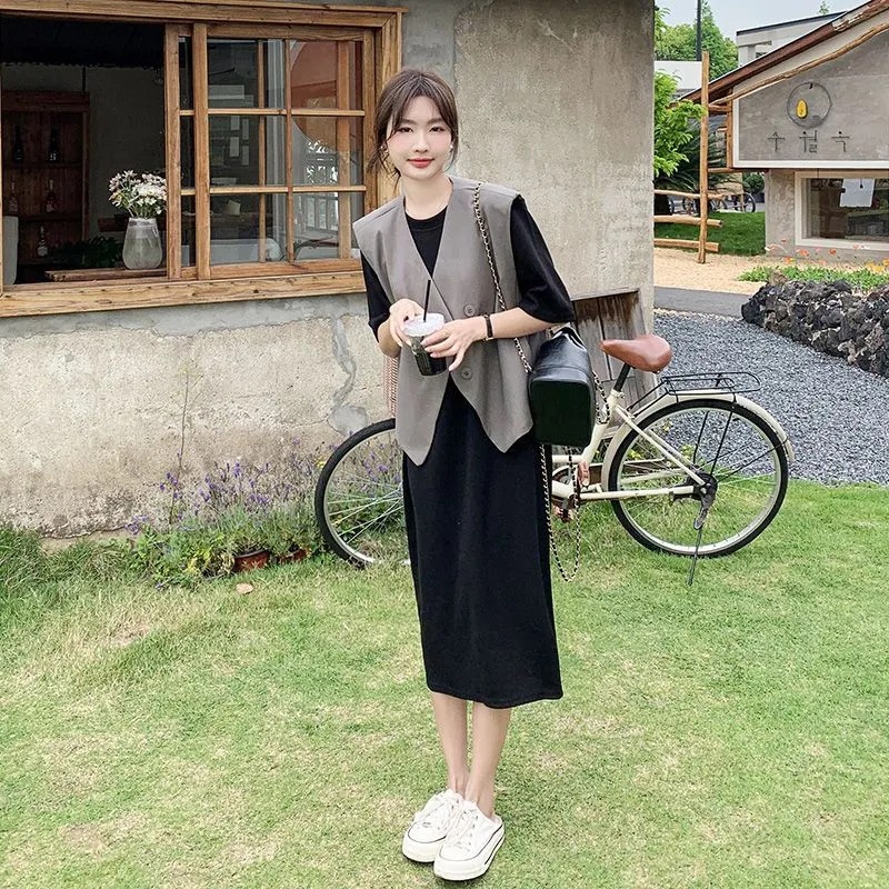 2024新作夏高級感ベストワンピース女性塩系軽熟風気質ストレートtシャツスカート2点セット