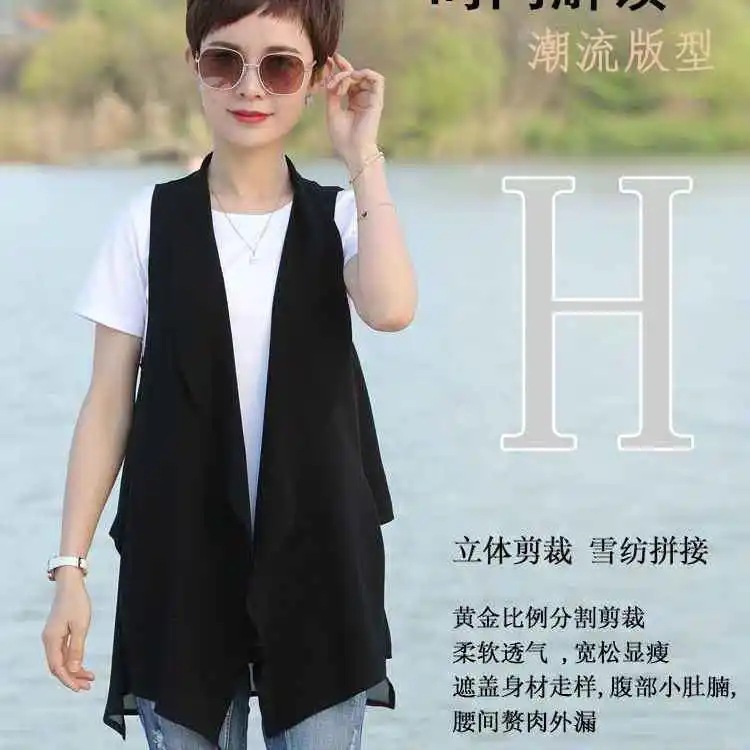 9117春の夏の大きいサイズの2024の新型のシフォンのベストの女性の中で長いタイプの薄いタイプのノースリーブのベストの外はカーディガンを掛けます。