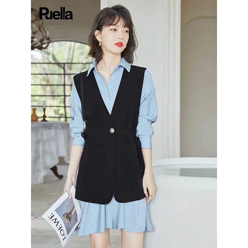 9185 ウールスカートレディースミドル丈 2024 春と秋の新しい気質 V ネックサスペンダードレスノースリーブ OL ベストスカート