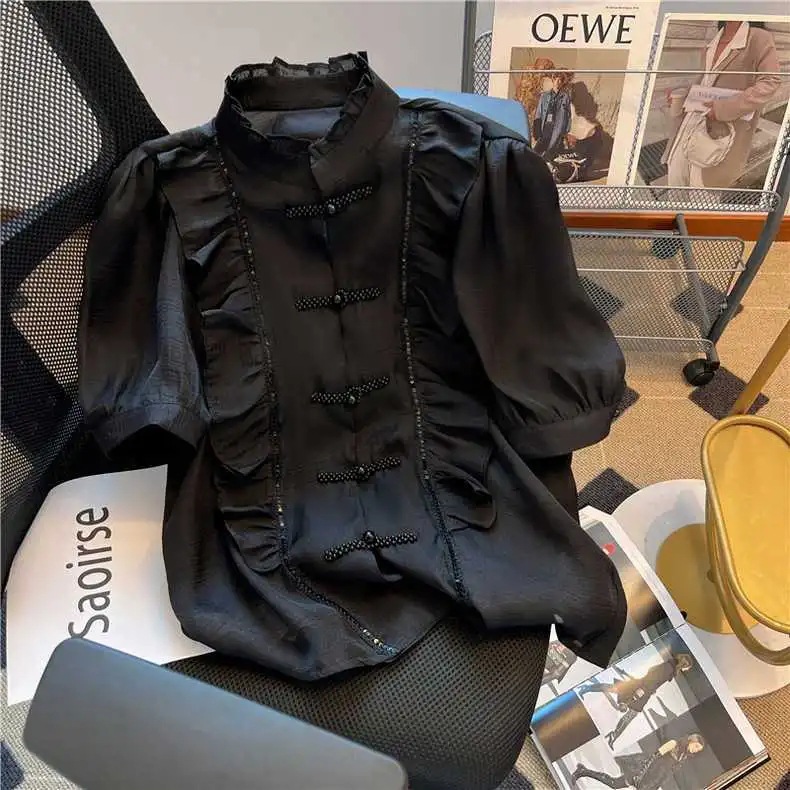 92832024 春夏スタンドカラー新中国風ボタンフリル前立て中国風シャツデザイン重工業国民トレンド
