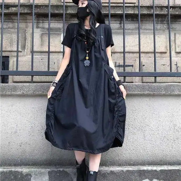 8897 ヨーロッパ商品 2024 夏 大きいサイズ ゆったり ミドル丈 無地 シンプルデザイン シャーリング オリジナル サスペンダースカート トレンド
