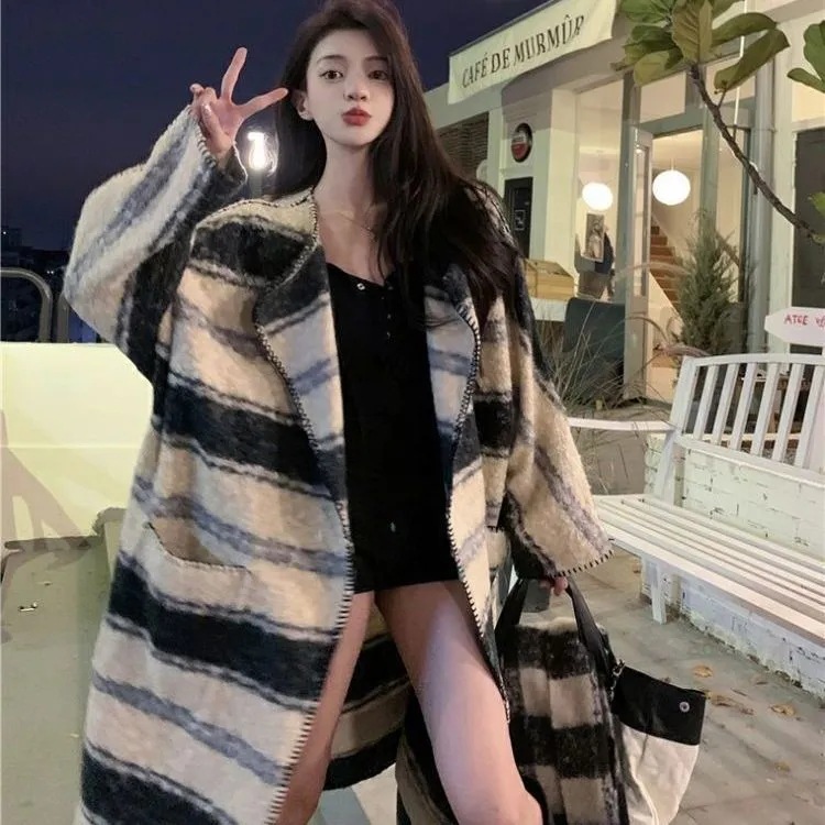 8991 Kuaishou インターネット有名人張ベニと同じ韓国風秋冬ルーズ気質ストライプ羊毛カーディガン