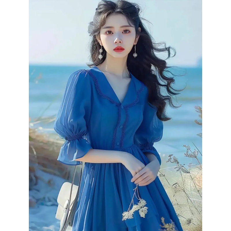9280フランス茶休絶美ブルー泡袖ワンピース2024夏の新型ウエストリゾート風フレッシュスカート