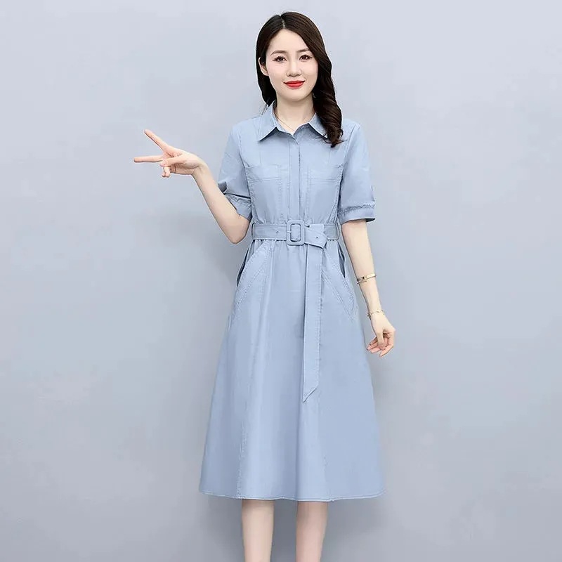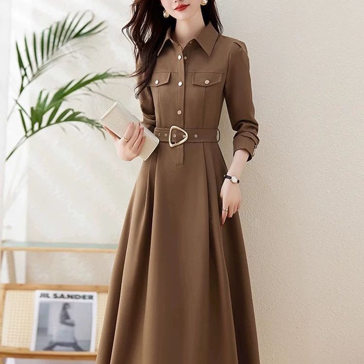 9311 春と秋の女性のための長袖シャツドレス 2025 新しいウエスト痩身気質ラペル膝上ロングスカート