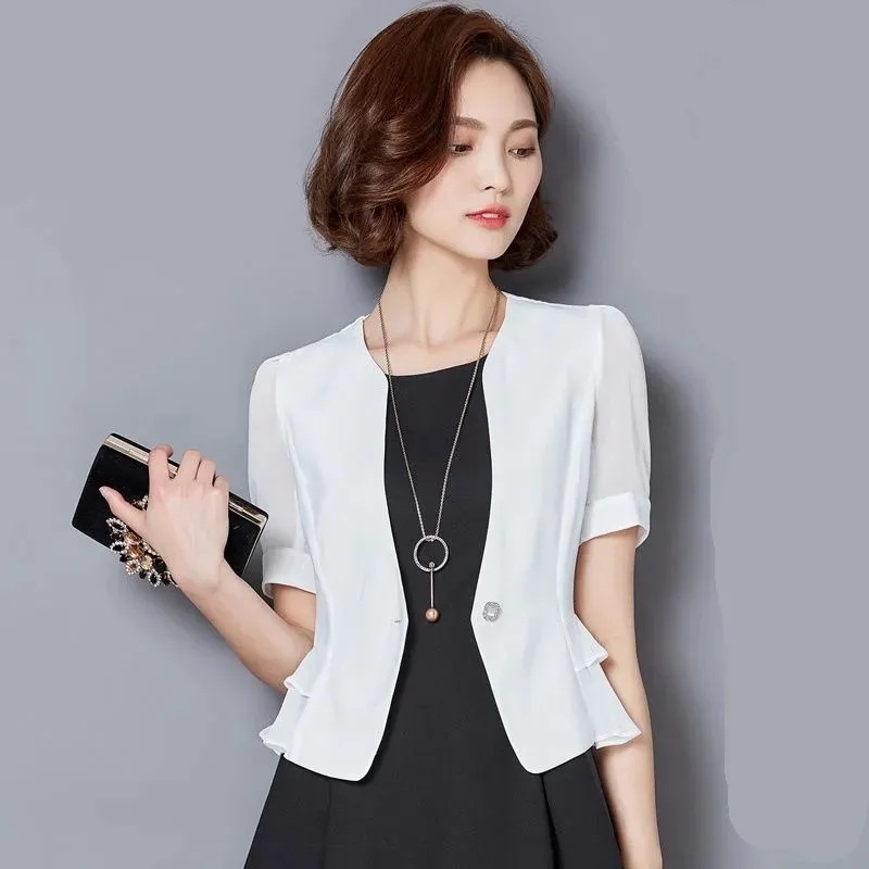 91092024年夏の新型の薄いスーツの女性の短いタイプはやせている白い上着の職業の半袖の薄いコートを現します。