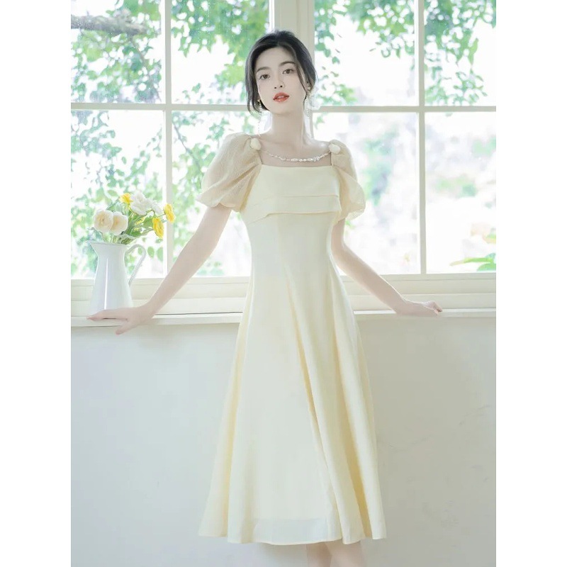 9071 フレンチウエスト痩身スクエアネックパフスリーブイエロードレスハイエンド妖精気質初恋ロングスカート夏